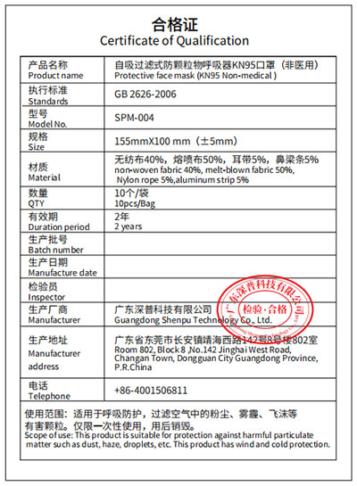 N95 хамгаалалтын маск (нугалах)-Certificate of Qualification